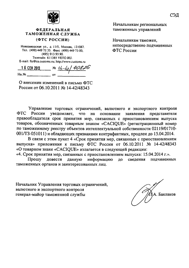 "О ВНЕСЕНИИ ИЗМЕНЕНИЙ В ПИСЬМО ФТС РОССИИ ОТ 06.10.2011 N 14-42/48343"