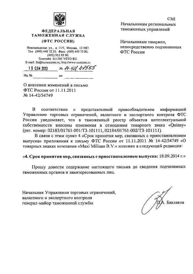 ПИСЬМО ФТС РФ от 19.09.2013 N 14-42/41565
