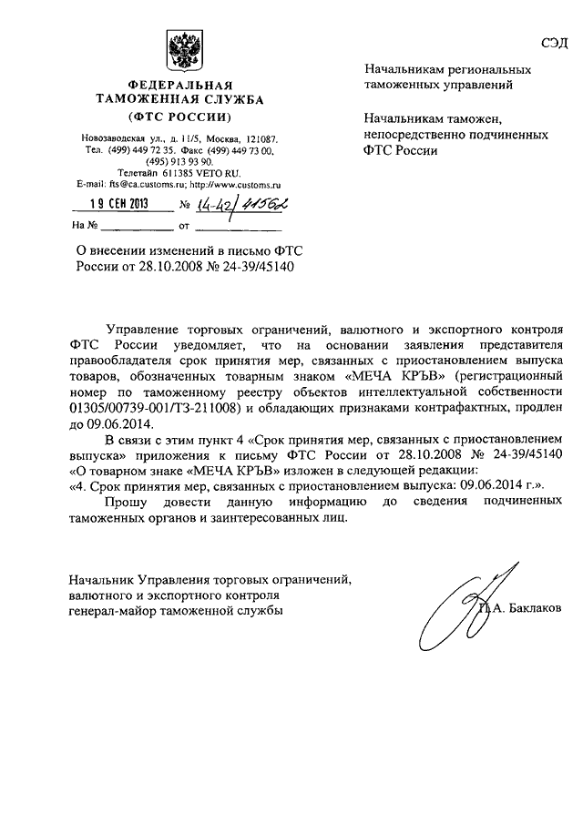 "О ВНЕСЕНИИ ИЗМЕНЕНИЙ В ПИСЬМО ФТС РОССИИ ОТ 28.10.2008 N 24-39/45140"