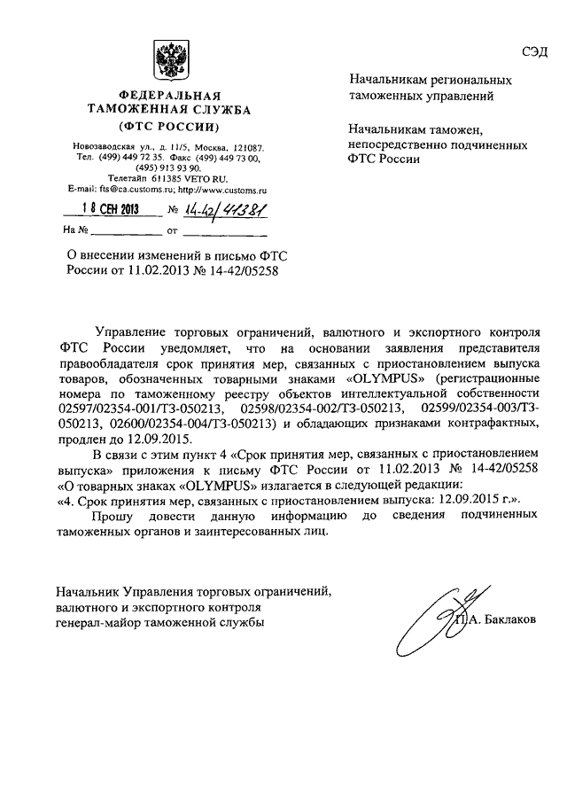 "О ВНЕСЕНИИ ИЗМЕНЕНИЙ В ПИСЬМО ФТС РОССИИ ОТ 11.02.2013 N 14-42/05258"