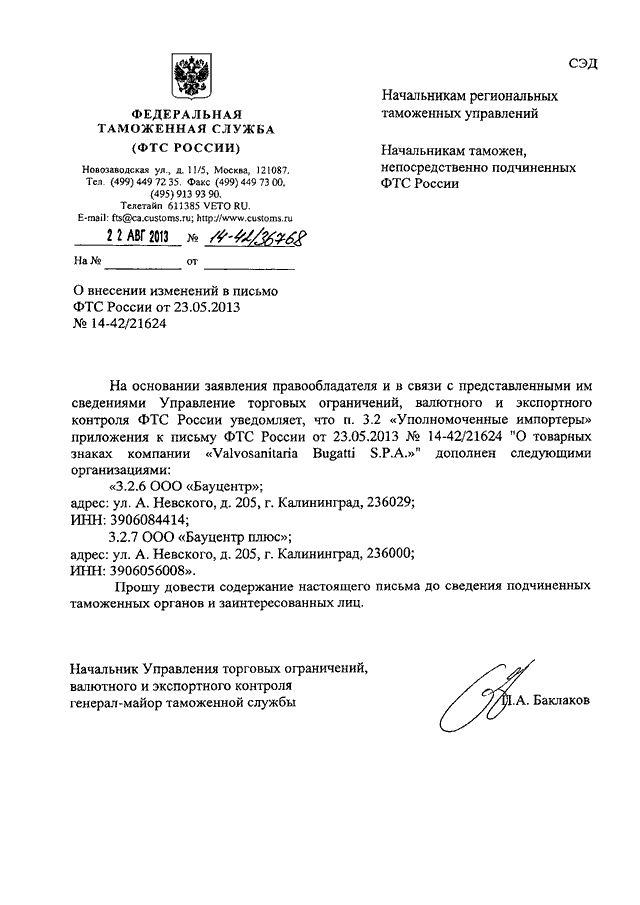 "О ВНЕСЕНИИ ИЗМЕНЕНИЙ В ПИСЬМО ФТС РОССИИ ОТ 23.05.2013 N 14-42/21624"