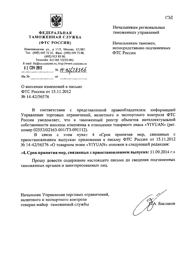 "О ВНЕСЕНИИ ИЗМЕНЕНИЙ В ПИСЬМО ФТС РОССИИ ОТ 15.11.2012 N 14-42/56576"