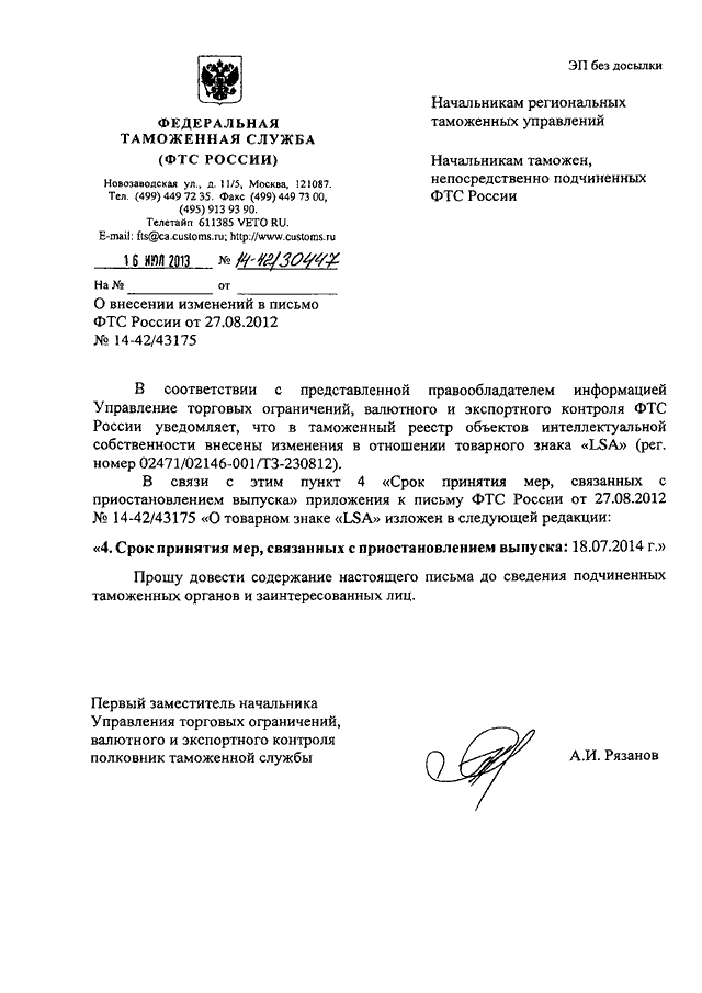"О ВНЕСЕНИИ ИЗМЕНЕНИЙ В ПИСЬМО ФТС РОССИИ ОТ 27.08.2012 N 14-42/43175"