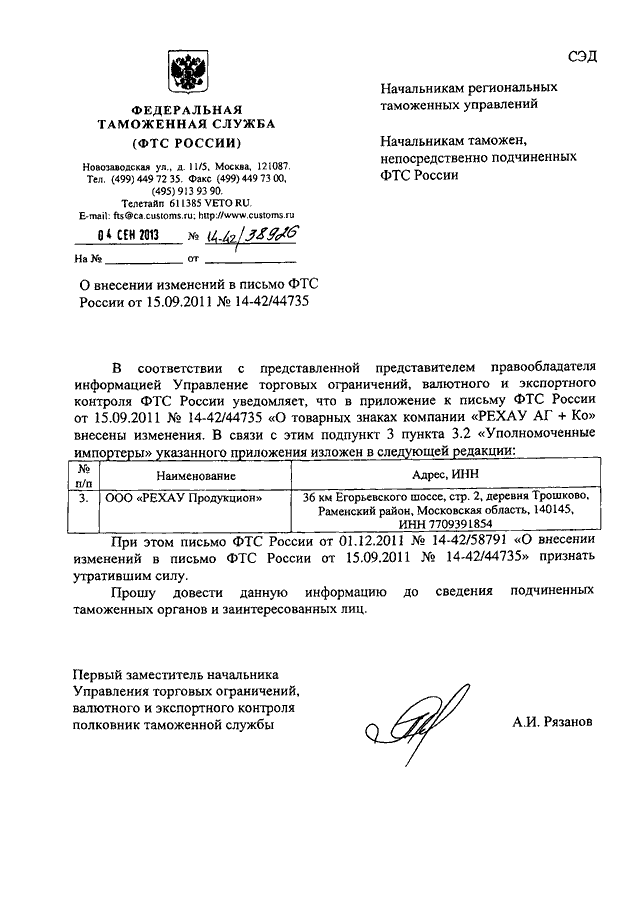 ПИСЬМО ФТС РФ от 04.09.2013 N 14-42/38926