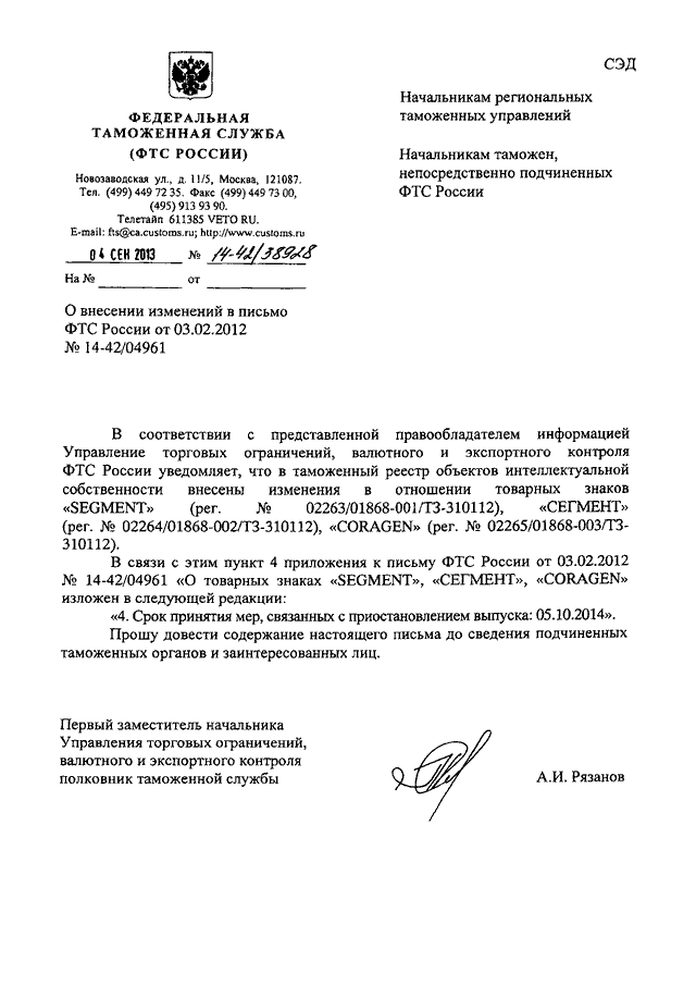 "О ВНЕСЕНИИ ИЗМЕНЕНИЙ В ПИСЬМО ФТС РОССИИ ОТ 03.02.2012 N 14-42/04961"