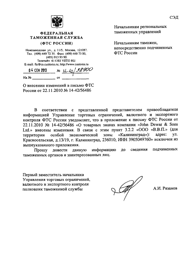 ПИСЬМО ФТС РФ от 04.09.2013 N 14-42/38900