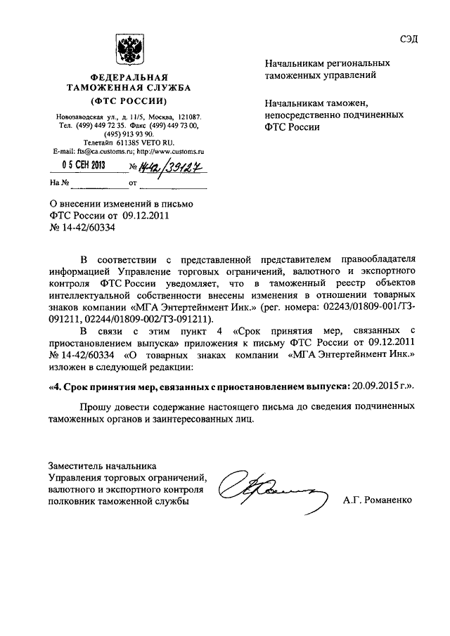 "О ВНЕСЕНИИ ИЗМЕНЕНИЙ В ПИСЬМО ФТС РОССИИ ОТ 09.12.2011 N 14-42/60334"