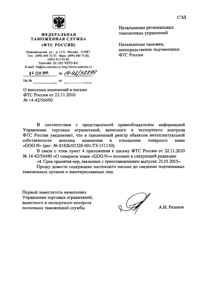 ПИСЬМО ФТС РФ от 04.09.2013 N 14-42/38899