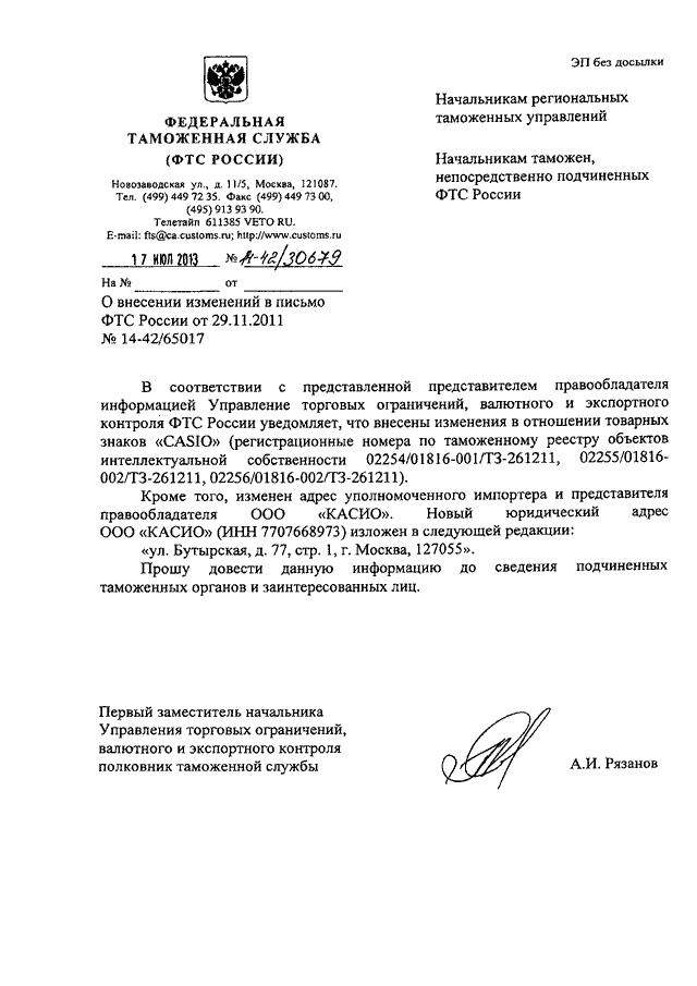 "О ВНЕСЕНИИ ИЗМЕНЕНИЙ В ПИСЬМО ФТС РОССИИ ОТ 29.11.2011 N 14-42/65017"
