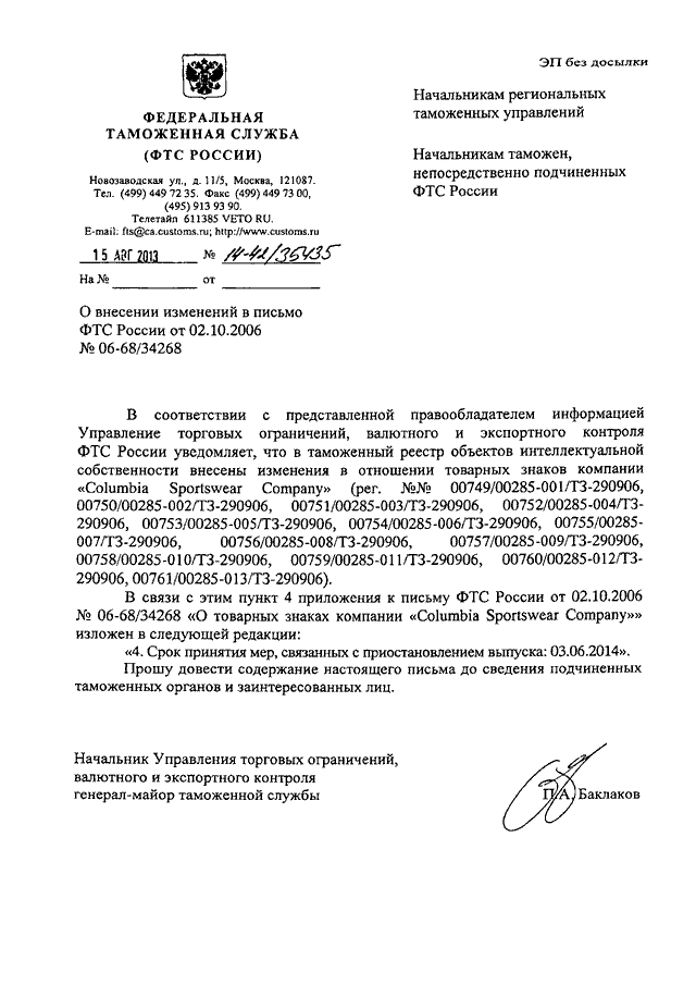 ПИСЬМО ФТС РФ от 15.08.2013 N 14-42/35435