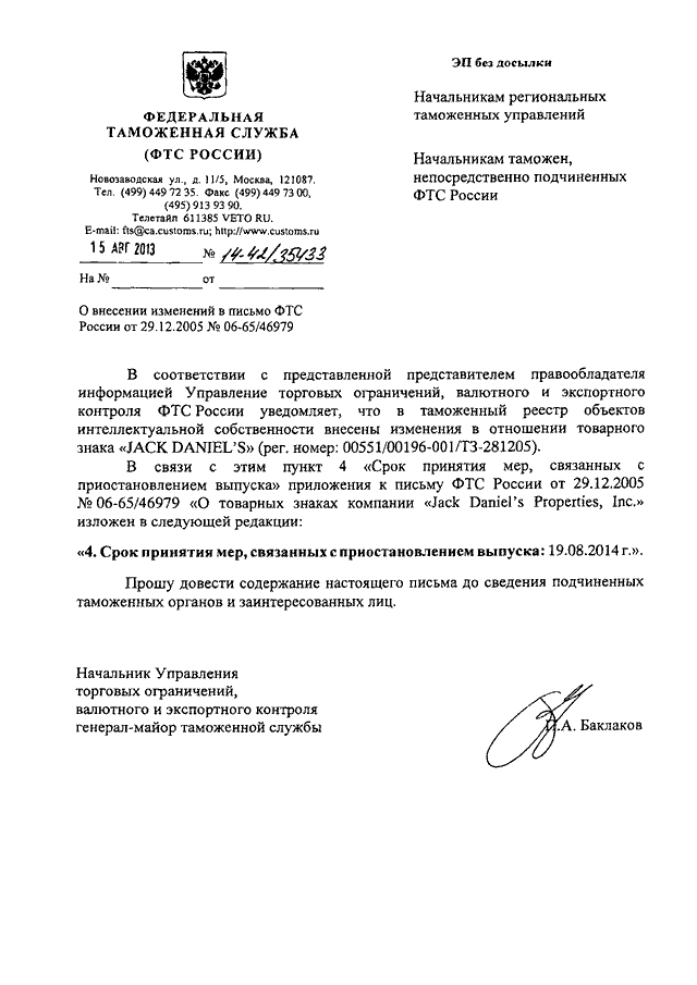 ПИСЬМО ФТС РФ от 15.08.2013 N 14-42/35433