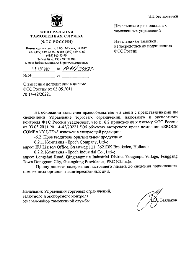 "О ВНЕСЕНИИ ДОПОЛНЕНИЙ В ПИСЬМО ФТС РОССИИ ОТ 03.05.2011 N 14-42/20221"