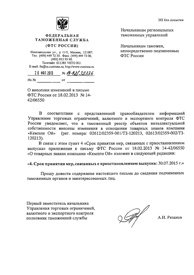 "О ВНЕСЕНИИ ИЗМЕНЕНИЙ В ПИСЬМО ФТС РОССИИ ОТ 18.02.2013 N 14-42/06550"