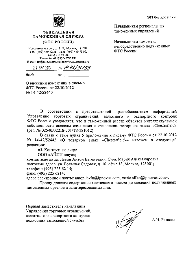 "О ВНЕСЕНИИ ИЗМЕНЕНИЙ В ПИСЬМО ФТС РОССИИ ОТ 22.10.2012 N 14-42/52443"