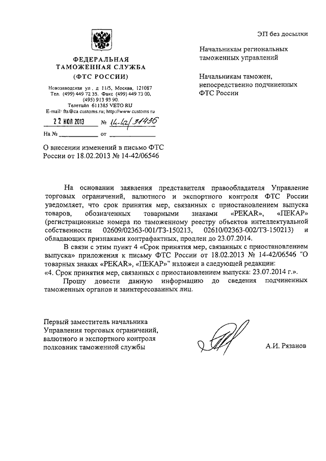 "О ВНЕСЕНИИ ИЗМЕНЕНИЙ В ПИСЬМО ФТС РОССИИ ОТ 18.02.2013 N 14-42/06546"