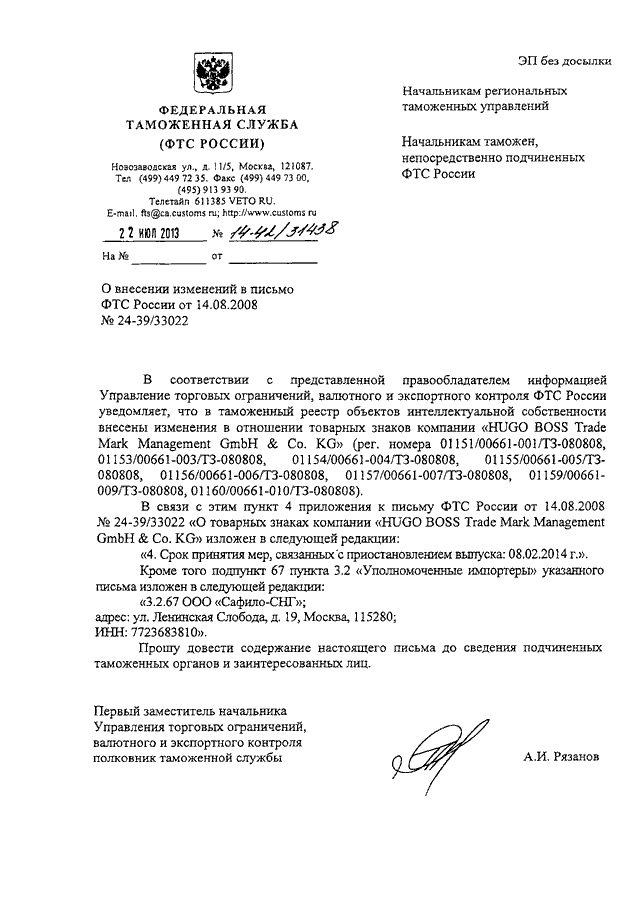 ПИСЬМО ФТС РФ от 22.07.2013 N 14-42/31438