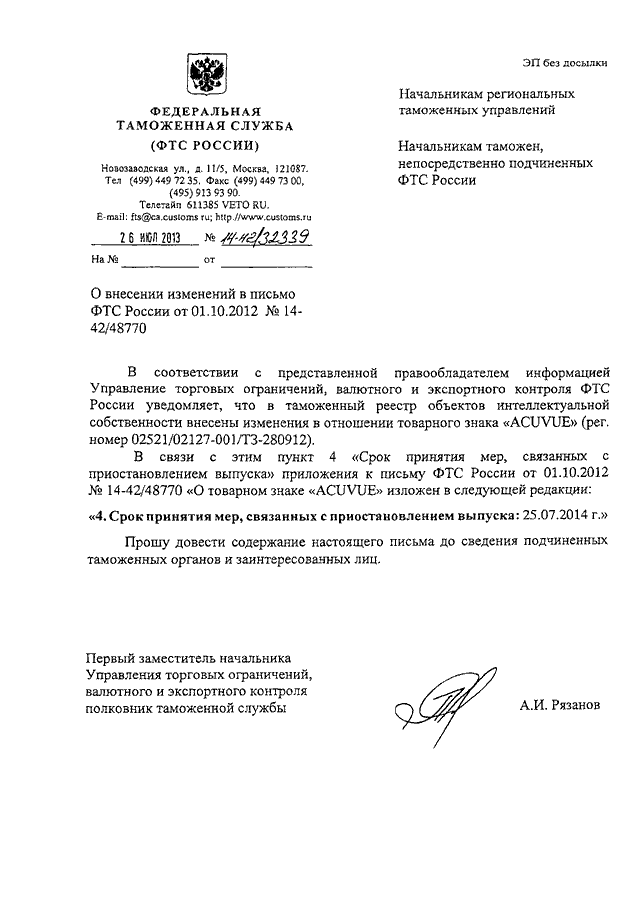 ПИСЬМО ФТС РФ от 26.07.2013 N 14-42/32339