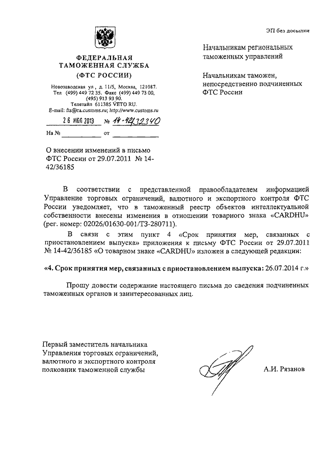 ПИСЬМО ФТС РФ от 26.07.2013 N 14-42/32340