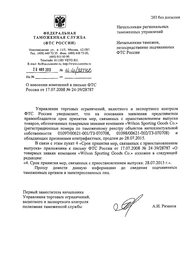 ПИСЬМО ФТС РФ от 26.07.2013 N 14-42/32342