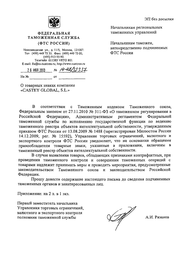ПИСЬМО ФТС РФ от 26.07.2013 N 14-42/32337