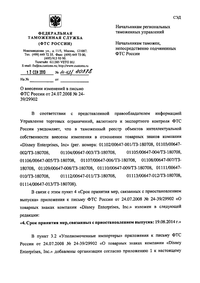 "О ВНЕСЕНИИ ИЗМЕНЕНИЙ В ПИСЬМО ФТС РОССИИ ОТ 24.07.2008 N 24-39/29902"