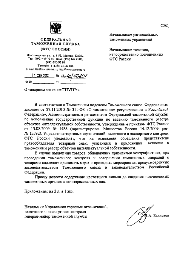ПИСЬМО ФТС РФ от 11.09.2013 N 14-42/40201