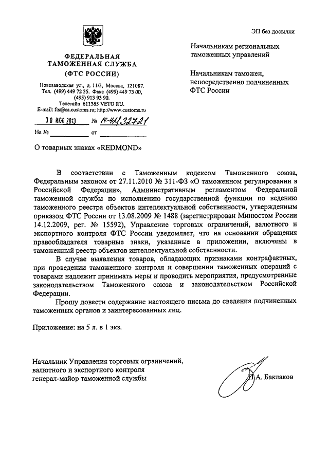 ПИСЬМО ФТС РФ от 30.07.2013 N 14-42/32721