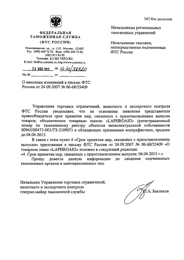 "О ВНЕСЕНИИ ИЗМЕНЕНИЙ В ПИСЬМО ФТС РОССИИ ОТ 24.09.2007 N 06-68/35409"