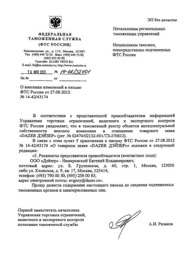 "О ВНЕСЕНИИ ИЗМЕНЕНИЙ В ПИСЬМО ФТС РОССИИ ОТ 27.08.2012 N 14-42/43174"
