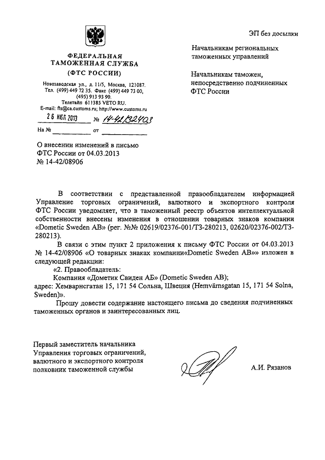 "О ВНЕСЕНИИ ИЗМЕНЕНИЙ В ПИСЬМО ФТС РОССИИ ОТ 04.03.2013 N 14-42/08906"