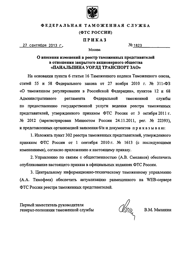 ПРИКАЗ ФТС РФ от 27.09.2013 N 1823