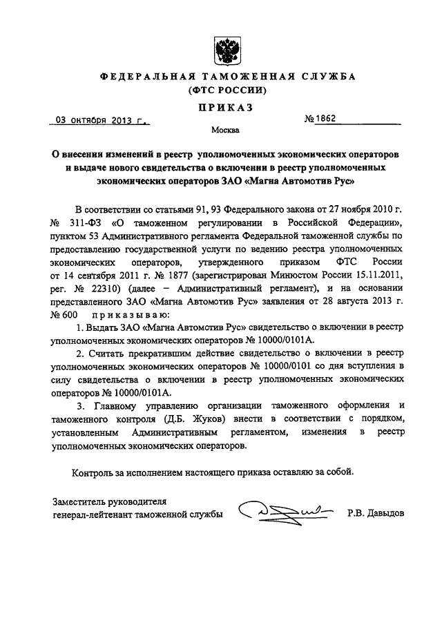 "О ВНЕСЕНИИ ИЗМЕНЕНИЙ В РЕЕСТР УПОЛНОМОЧЕННЫХ ЭКОНОМИЧЕСКИХ ОПЕРАТОРОВ И ВЫДАЧЕ НОВОГО СВИДЕТЕЛЬСТВА О ВКЛЮЧЕНИИ В РЕЕСТР УПОЛНОМОЧЕННЫХ ЭКОНОМИЧЕСКИХ ОПЕРАТОРОВ ЗАО "МАГНА АВТОМОТИВ РУС"