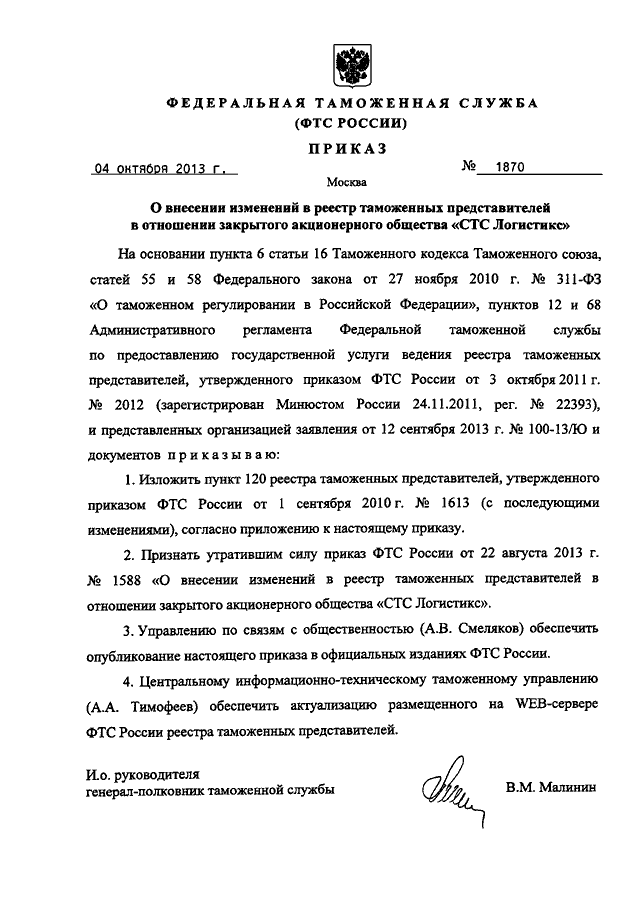 ПРИКАЗ ФТС РФ от 04.10.2013 N 1870