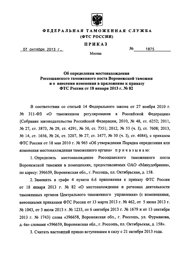 "ОБ ОПРЕДЕЛЕНИИ МЕСТОНАХОЖДЕНИЯ РОССОШАНСКОГО ТАМОЖЕННОГО ПОСТА ВОРОНЕЖСКОЙ ТАМОЖНИ И О ВНЕСЕНИИ ИЗМЕНЕНИЯ В ПРИЛОЖЕНИЕ К ПРИКАЗУ ФТС РОССИИ ОТ 18 ЯНВАРЯ 2013 Г. N 82"