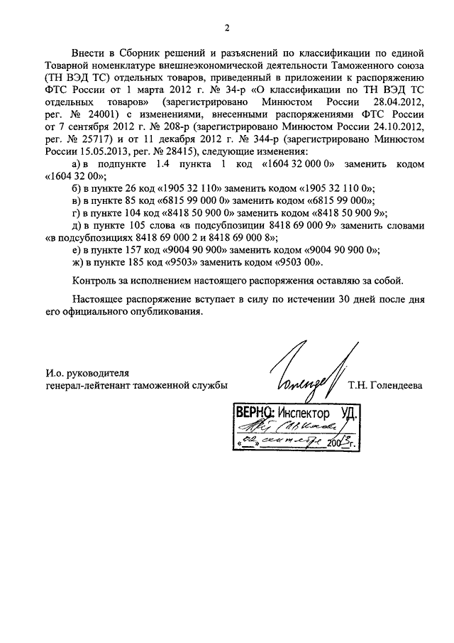 2012 Г. N 34-Р "О КЛАССИФИКАЦИИ ПО ТН ВЭД ТС ОТДЕЛЬНЫХ ТОВАРОВ" (Зарегистрировано в Минюсте РФ 10.10.2013 N 30136)