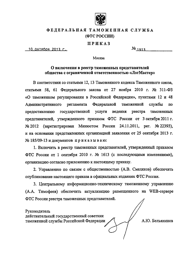 ПРИКАЗ ФТС РФ от 10.10.2013 N 1913