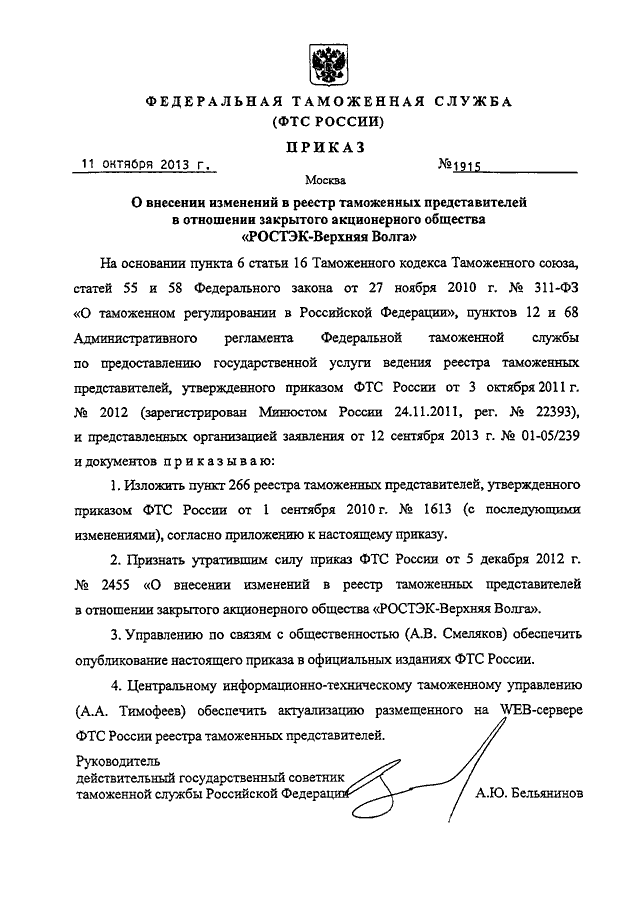 ПРИКАЗ ФТС РФ от 11.10.2013 N 1915