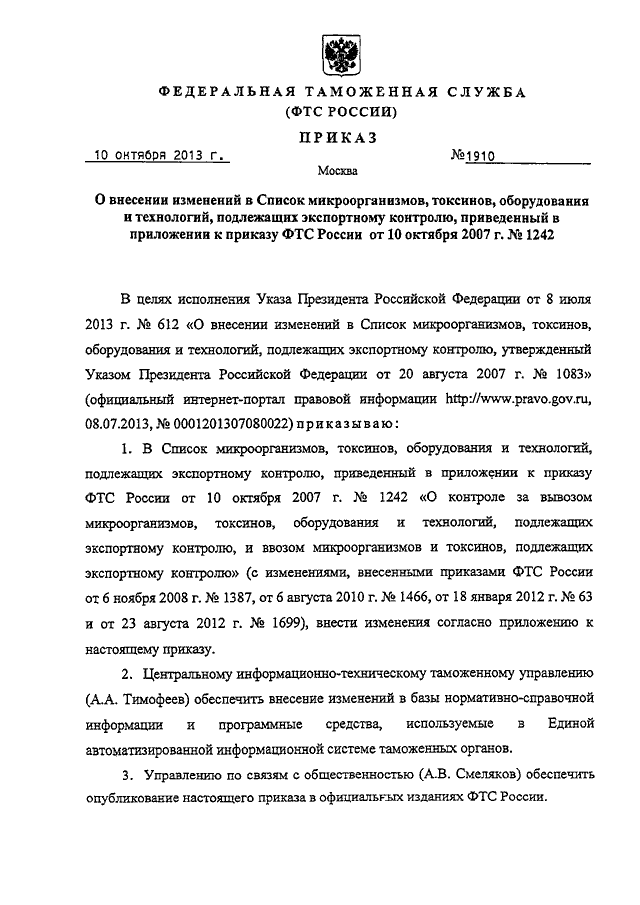 "О ВНЕСЕНИИ ИЗМЕНЕНИЙ В СПИСОК МИКРООРГАНИЗМОВ, ТОКСИНОВ, ОБОРУДОВАНИЯ И ТЕХНОЛОГИЙ, ПОДЛЕЖАЩИХ ЭКСПОРТНОМУ КОНТРОЛЮ, ПРИВЕДЕННЫЙ В ПРИЛОЖЕНИИ К ПРИКАЗУ ФТС РОССИИ ОТ 10 ОКТЯБРЯ 2007 Г. N 1242"