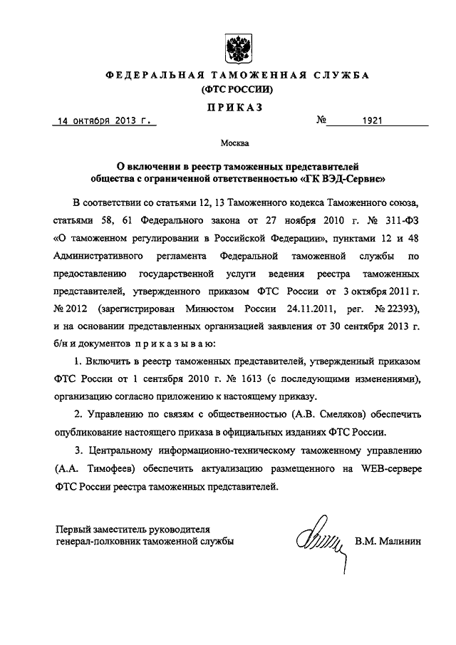 ПРИКАЗ ФТС РФ от 14.10.2013 N 1921