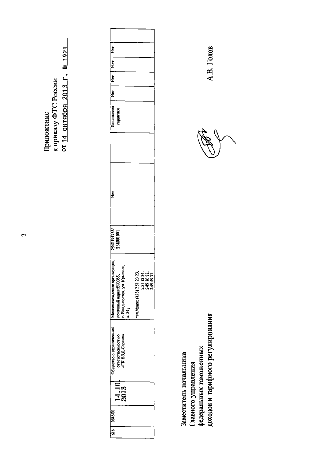 ПРИКАЗ ФТС РФ от 14.10.2013 N 1921