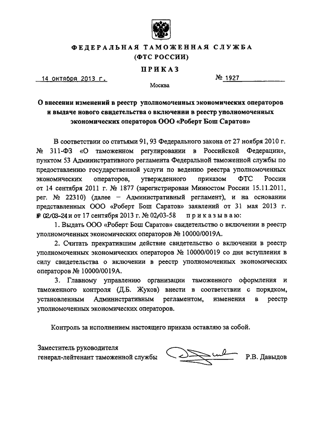 "О ВНЕСЕНИИ ИЗМЕНЕНИЙ В РЕЕСТР УПОЛНОМОЧЕННЫХ ЭКОНОМИЧЕСКИХ ОПЕРАТОРОВ И ВЫДАЧЕ НОВОГО СВИДЕТЕЛЬСТВА О ВКЛЮЧЕНИИ В РЕЕСТР УПОЛНОМОЧЕННЫХ ЭКОНОМИЧЕСКИХ ОПЕРАТОРОВ ООО "РОБЕРТ БОШ САРАТОВ"