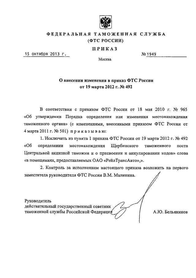ПРИКАЗ ФТС РФ от 15.10.2013 N 1949