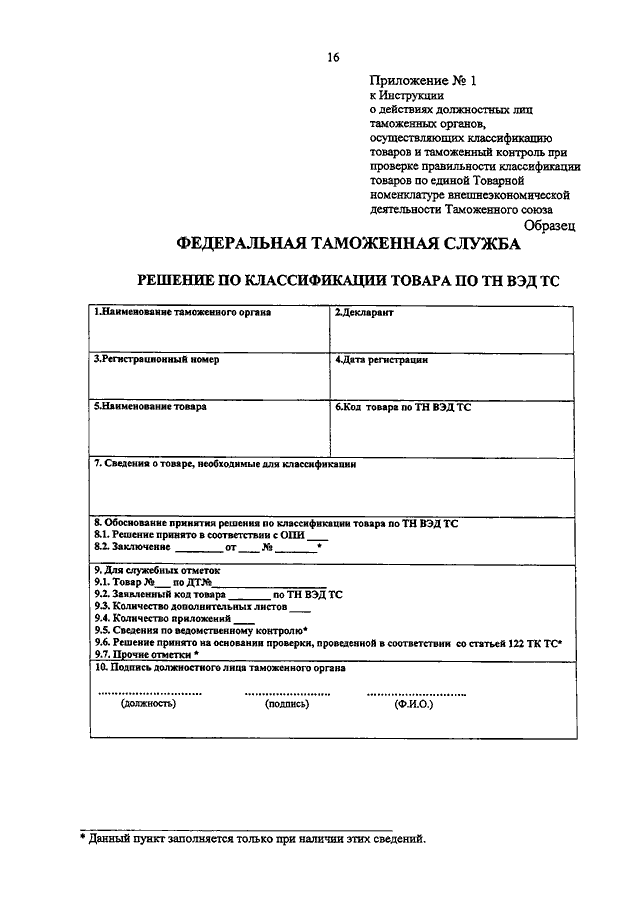 "ОБ УТВЕРЖДЕНИИ ИНСТРУКЦИИ О ДЕЙСТВИЯХ ДОЛЖНОСТНЫХ ЛИЦ ТАМОЖЕННЫХ ОРГАНОВ, ОСУЩЕСТВЛЯЮЩИХ КЛАССИФИКАЦИЮ ТОВАРОВ И ТАМОЖЕННЫЙ КОНТРОЛЬ ПРИ ПРОВЕРКЕ ПРАВИЛЬНОСТИ КЛАССИФИКАЦИИ ТОВАРОВ ПО ЕДИНОЙ ТОВАРНОЙ НОМЕНКЛАТУРЕ ВНЕШНЕЭКОНОМИЧЕСКОЙ ДЕЯТЕЛЬНОСТИ ТАМОЖЕННОГО СОЮЗА"