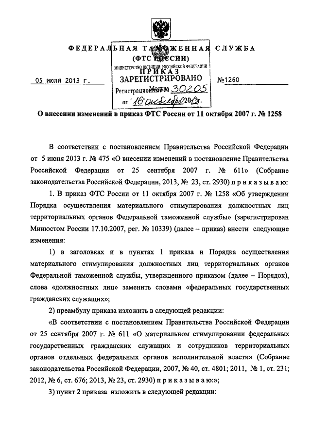 ПРИКАЗ ФТС РФ от 05.07.2013 N 1260