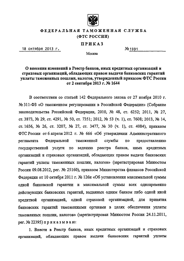 ПРИКАЗ ФТС РФ от 18.10.2013 N 1991 "О ВНЕСЕНИИ ИЗМЕНЕНИЙ В РЕЕСТР БАНКОВ, ИНЫХ КРЕДИТНЫХ ОРГАНИЗАЦИЙ