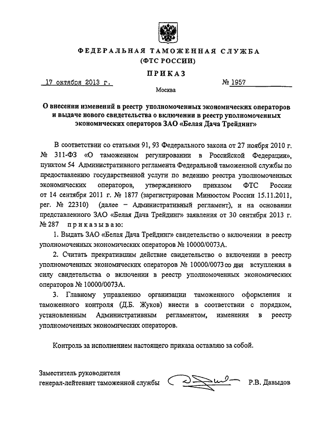 ПРИКАЗ ФТС РФ от 17.10.2013 N 1957