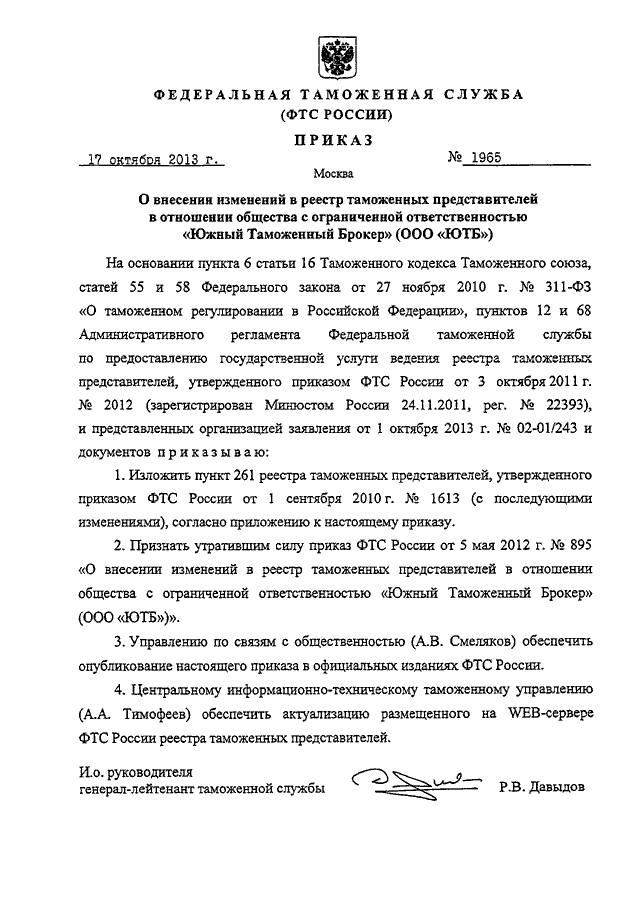 ПРИКАЗ ФТС РФ от 17.10.2013 N 1965