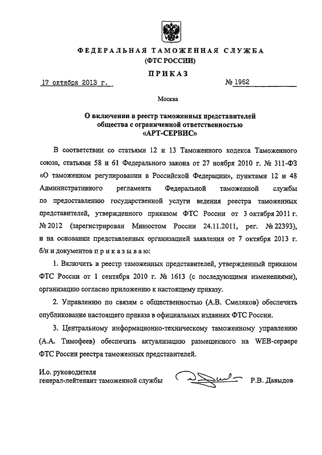 ПРИКАЗ ФТС РФ от 17.10.2013 N 1962