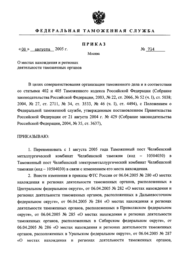 ПРИКАЗ ФТС РФ от 08.08.2005 N 714