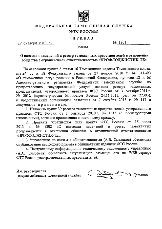 ПРИКАЗ ФТС РФ от 17.10.2013 N 1961
